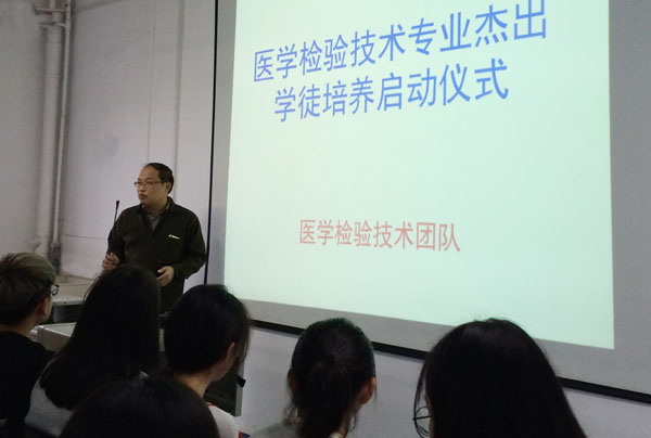 10月12日15:00,医药学院在尚贤阁305教室隆重举行医学检验技术专业杰出学徒培养开班仪式。医药学院副院长丁海峰、医学检验团队专兼职教师、辅导员和2016级医学检验技术专业50名学生参加了开班仪式,仪式由张静老师主持。