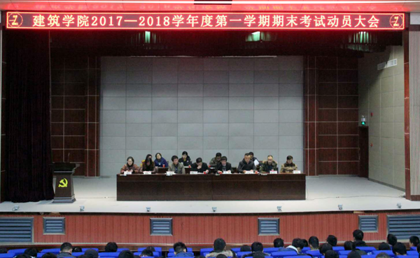 2017年12月13日晚上18:20分,建筑学院在学术报告厅召开2017-2018学年度第一学期期末考试动员大会。建筑学院全体班子成员、专业主任、辅导员及2016、2017级全体学生共计600多人参加了会议。会议由建筑学院党总支副书记陈胜红主持。