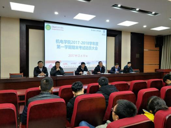 院长方玮作期末考试动员讲话,他结合学习十九大精神分析了我国的政治、经济、科技、文化、军事实力及国际地位,讲述了学校各项事业发展的良好态势,重点介绍了机电学院的订单培养、专业发展、就业前景,希望同学们高度重视、提振精神,掌握知识和技能,提升素质和能力。他肯定了一学期以来同学们的良好表现和突出成绩,他要求同学们学习制度、认真复习、积极备考、端正考风、严肃考纪、诚信考试,预祝同学们在本次期末考试中取得好成绩,给学校、老师、家长交一份满意的答卷。
