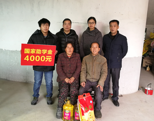 走访慰问过程中,黄忠一行与家长亲切地唠家常,仔细询问了郭云聪同学的家庭生活情况,得知:郭云聪同学属精准扶贫家庭。母亲长期患病,丧失劳动力。父亲为了照顾生病的母亲,只能在家务农,偶尔在当地打临工,补贴家用。去年家里原有土砖房跨塌,让这个捉襟见肘的家庭雪上加霜。后靠村里帮忙借贷新建了二层毛坯楼房。在了解到该生家庭情况后,黄忠等亲自送上了食用油、大米等慰问品和国家一等助学金。并向郭云聪一家介绍了国家的资助政策,让学生和家长在寒冬中也感受到了来自学校春天般的温暖。同时对郭云聪同学提出殷切希望,鼓励他在逆境中自强不息,在学习上勤奋刻苦,在生活上勤俭节约。争取将来能成为有用之才,回报长辈、回报母校、回报社会。
