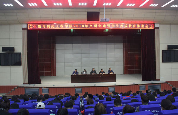 4月8日晚,生物与制药工程学院在学术报告厅举行本学期文明创建工作推进会暨学风建设动员大会。院长余亮彬、党总支副书记程喜荣、办公室主任刘泽波、团总支书记朱元锋以及全体辅导员和在校学生参加了本次大会。会议由副院长周桃英主持。