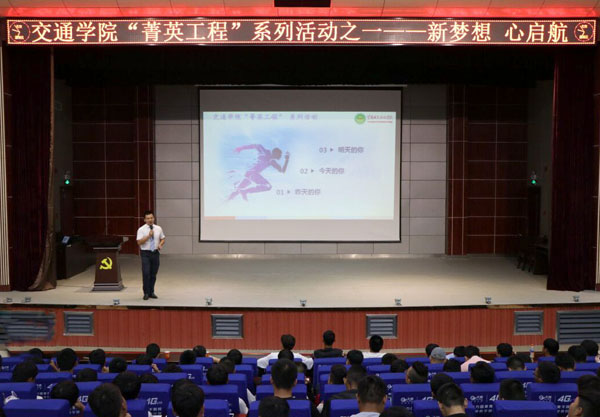 9月28日晚,交通学院在学术报告厅举行“菁英工程”系列活动开篇讲座——新梦想 心启航,副院长聂进主讲,全体专兼职辅导员及500余名2018级新生到场聆听,党总支副书记黄忠主持讲座。