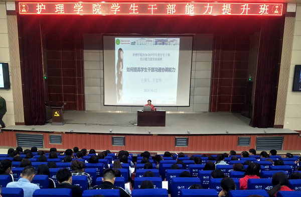10月12日,护理学院在学术报告厅举办2018年下半年学生干部能力提升班开班仪式。护理学院党总支书记王莹华、党总支副书记张朋生、心理辅导员张英、学工干事邱姗姗,学院全体学团干部、2017级班长团支书、2018级全体班干部参加了开班仪式。活动由团总支副书记郑伟主持。