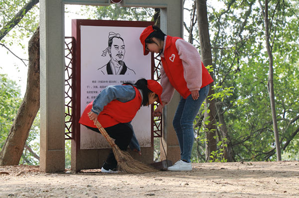 志愿者们早早地来到目的地,他们穿上红色马甲,手拿火钳和塑料袋等清扫工具,在社区工作人员的带领下,大家迅速投入到工作中,在公园的草丛中捡拾纸屑、烟头等垃圾,同时清扫道路上的落叶,为游人提供了一个舒适安逸、干净整洁、轻松愉悦的公园环境。在凉亭下,志愿者们与游客亲切地交谈,主动为游客提供肩颈按摩服务,这种举动暖心的举动获得了游客的声声称赞。