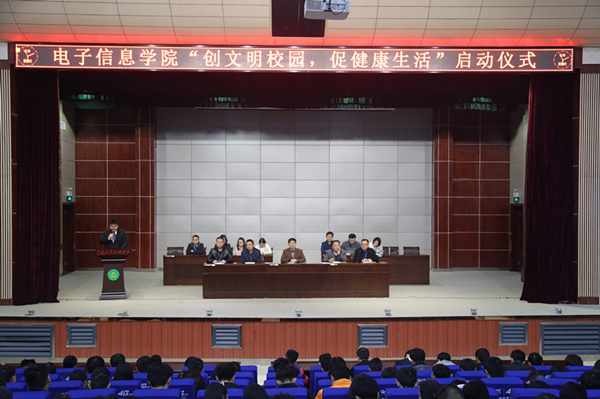 3月17日晚,电子信息学院在学术报告厅举行了以“创文明校园,促健康生活”为主题的大型文明创建活动的启动仪式。校党委委员、工会主席、宣传部部长郑柏松,学工处处长熊楚舒,电子信息学院院长罗幼平出席启动仪式,电子信息学院全体专兼职辅导员和全体学生参加了活动。