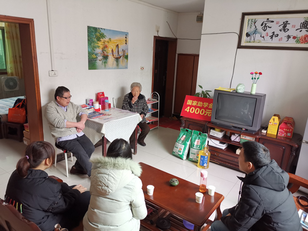 为了加强学校与学生家庭的联系和沟通,了解家庭经济困难学生的实际情况,让家庭经济困难学生及其家庭感受到学校的深切关爱,12月10日,商学院团总支负责人、学工党支部书记占时杰带领商学院资助管理员陈姗及19级商务英语专业辅导员周珊红一起来到商英201901班黄州区宝塔村的贫困生夏雨晨家里,为贫困学子家庭送去了冬日的温暖。