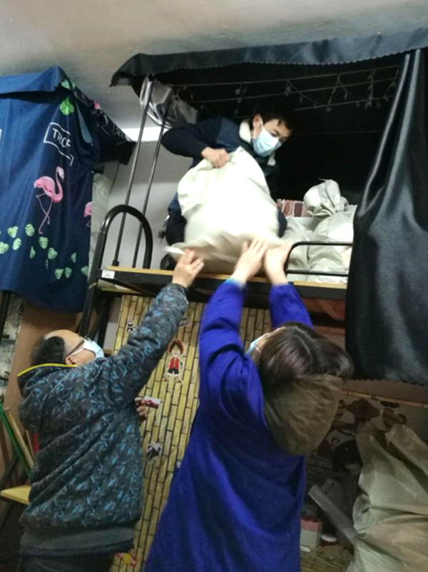 图书馆被分到了24栋的30间寝室,这些寝室物品多,而且凌乱,但我们丝毫没有怨言,说干就干,每人负责3-4间,首先是将学生的物品进行分类整理打包,然后往上铺搬运,再打扫寝室卫生、把柜子贴上封条,最后用油布将物品进行密封处理。