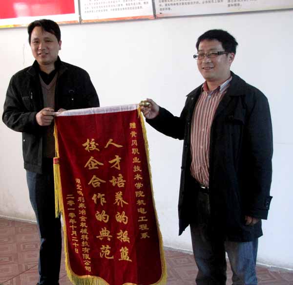 2010年10月26日上午,湖北鸣利来冶金机械科技有限公司汪学军总经理及生产部部长徐恩六一行为机电工程系送来一面印有“人才培养的摇篮,校企合作的典范”的锦旗。机电工程系党总支书记冯灵武、主任倪祥明、总支副书记夏俊章、副主任黄国祥等人接待了汪学军一行。