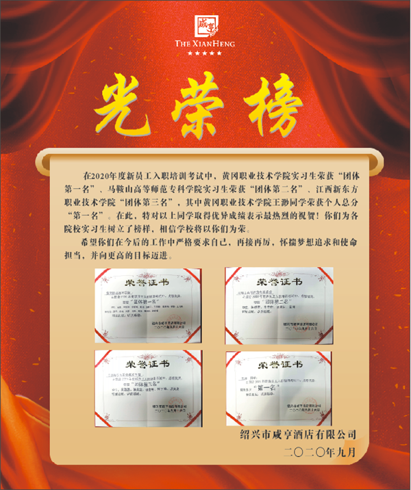 日前,Beat365中文官方网站收到浙江绍兴咸亨主题酒店的培训考核荣誉证书。在公司2020年度新员工入职培训考试中,黄职学子以最高平均分的绝对优势获得团体第一名;王渺、李玉婷、舒雅琪三位同学在个人成绩排名中包揽前三名。经过考核竞争,学校五位实习生获得前厅文化使者工作岗位。