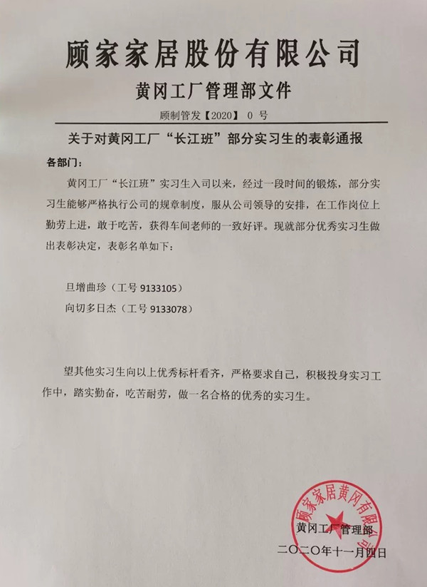 近日,顾家家居黄冈有限公司给学校发来通报表彰,商学院校企合作“长江班”学生会计201803班旦增曲珍、会计201803班向切多日杰在实习期间勤于实践、肯于吃苦、乐于奉献,发扬了“勇争一流”的进取精神,弘扬了“精益求精”的工匠精神,展现了黄冈职院学子的奋斗热情和青年担当,业绩突出,成绩斐然,深受实习单位领导、同事、实习生的好评。此次顾家家居黄冈有限公司发来的通报表彰,将进一步激发实习生们学习示范、争当先锋的干劲和激情,为实习生们圆满完成实习任务注入强劲动力。