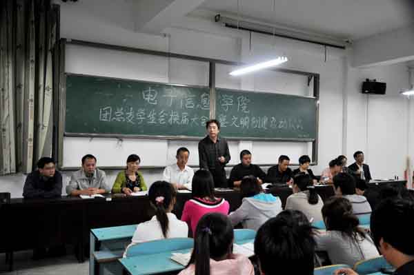 10月17日,电子信息学院组织团总支学生会全体学生干部、在校各班级主要学生干部、各寝室的寝室长在育贤阁103教室隆重举行第十三届学生干部换届任命暨文明创建动员大会。参加大会的领导老师有:电子信息学院党总支书记朱建军、副书记陈胜红、女生辅导员陈桃荣及全体专兼职辅导员老师,大会由院团总支副书记魏鹏主持。