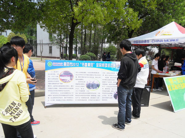 2012年4月23日,是第十七个世界读书日,4月份也是“黄冈全民阅读”启动月。为倡导多读书、读好书的校园风尚,推进校园精神文明建设,创建和谐的校园文化氛围,大力宣传推广全民阅读活动和世界读书日,由黄冈职院图书馆和宣传部举办、黄冈职院大学生读书协会具体承办的以“书香溢满校园”为主题的系列读书活动,4月21日拉开帷幕。