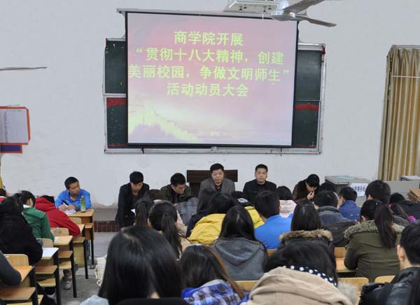 此次大会的召开,是商学院全体师生学习贯彻十八大精神的体现,是迎接省级最佳文明单位验收,争创全国文明单位的再动员。此次大会为 “贯彻十八大精神 创建美丽校园 争做文明师生”活动的开展吹响了号角,奠定了基础。