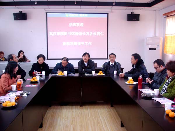 2012年11月29日,国家示范高职院校武汉职业技术学院图书馆馆长柳金发率全馆职工来Beat365图书馆交流,受到图书馆馆长段茂盛、副馆长刘开国及全馆工作人员的热情接待。