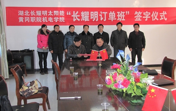 2012年12月11日下午,机电学院与湖北长耀明太阳能股份有限公司在学院会议室举行校企合作、订单培养签约仪式。湖北长耀明太阳能股份有限公司总经理张琰、光热联盟副秘书长陈栋、技术部部长袁春林、办公室主任倪琳,机电学院总支书记丁茂喜、院长倪祥明、副院长黄国祥、能源系主任祁小波及专业团队负责人姜永豪出席了签约仪式。