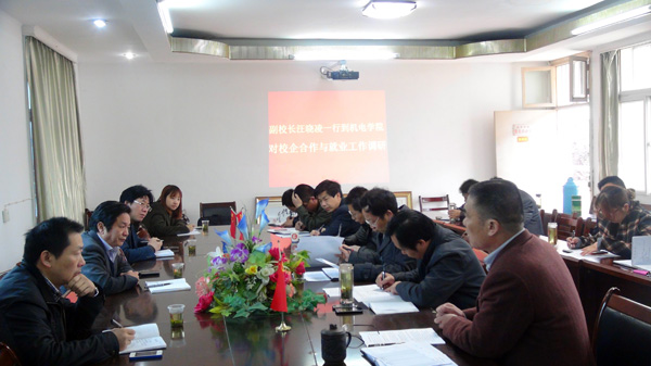 2013年4月23日上午,副校长汪晓凌率就业处副处长舒瑞琼、校企合作处副处长吴怀涛一行到机电学院就学生就业与校企合作工作进行深入调研,机电学院全体院领导、各系主任、实训中心主任、专业团队负责人、就业联络员、教务员及毕业班辅导员参加了本次调研座谈会。
