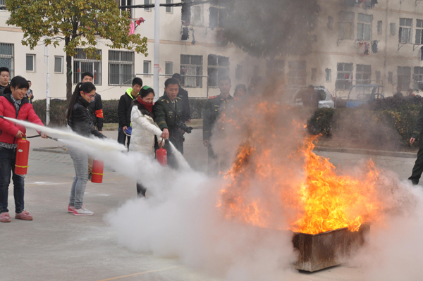灭火演示及演练在中6舍前空地举行。首先,消防大队官兵作示范,使用干粉灭火器扑灭油槽内大火,然后在官兵们的指导下,参演师生分组操练,大火一次又一次被迅速扑灭。