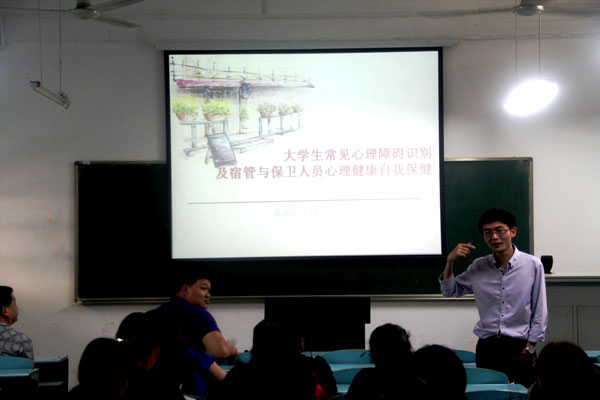2014年5月18日下午2点30分,由Beat365学工处心理咨询中心、宿管中心主办的“大学生心理障碍识别及宿管与保卫人员心理健康与自我保健”专题心理讲座在育贤阁302教室举行。校团委书记杨勇、保卫处副处长汤城等有关领导及全校宿管与保卫人员参加了此次讲座。本次活动由宿管中心主任魏传钧主持。