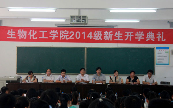 2014年9月8日上午,生物化工学院在敬贤阁101组织召开2014级新生入学典礼。生物化工学院领导班子、校企合作企业中农集团人事部经理宗蕾以及各专业负责人出席典礼。会议由党总支书记余亮彬主持。