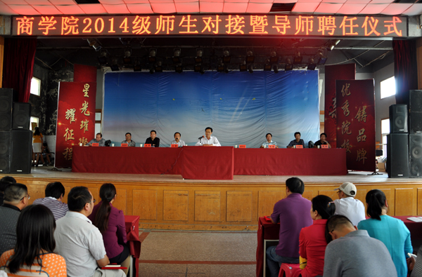 10月11日下午2点,商学院2014级师生对接暨导师聘任仪式在大学生活动中心举行。参加仪式的有校党委委员、教务处长夏学文,校团委书记杨勇,商学院班子成员、系主任、专业负责人、实训中心负责人、全体导师、全体辅导员以及2014级全体学生。仪式由商学院党总支书记白颢主持。