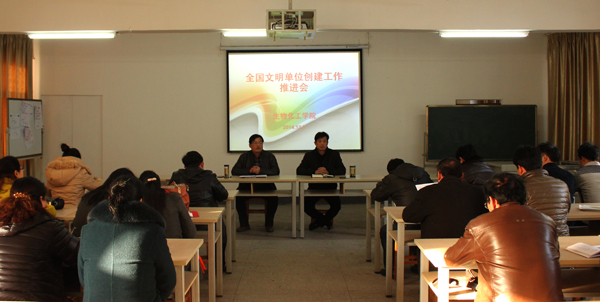 2014年12月8日,生物化工学院召开全体教职工专题会议,就全国文明单位创建工作进行决战前的部署和推进。大会由院长陈全胜主持,党总支书记余亮彬作全面的动员和部署。