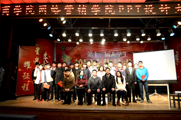 2014年12月11日18:30,由商学院网络营销学院主办的第一届PPT设计大赛决赛在大学生活动中心举行,商学院副院长罗建文出席并发表讲话。网络营销学院常务副院长姜艳平,商务系副主任兼网络营销学院副院长刘丽,武汉慧众聚成科技有限公司产品部总监兼网络营销学院教研室主任余涛,商学院团总支负责人马亚飞,网络营销学院专业讲师赵灿、王晓娟及网络营销学院全体师生参加了活动。