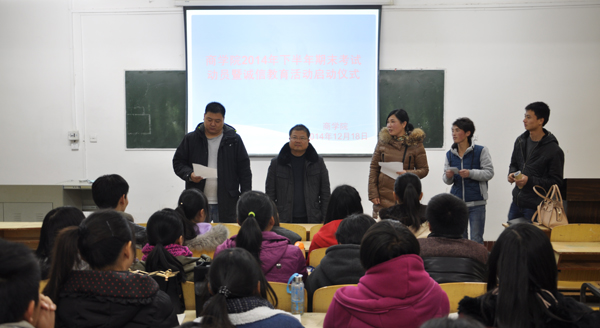 12月18日,商学院全面启动期末考试学生诚信教育活动。晚上18:20,活动启动仪式在群贤阁409教室举行。参加活动启动仪式的有商学院党总支副书记焦爱新,团总支副书记马亚飞,女生辅导员万建华,部分辅导员老师和部分学生代表。