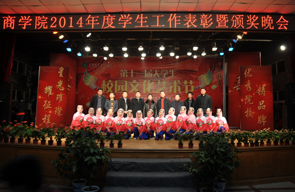 12月26日晚18:10,商学院举行2014年度学生工作表彰暨颁奖晚会。学工处处长熊楚舒,校团委书记杨勇,学生宿舍管理中心主任魏传钧,学生教育管理科副科长吴冬,商学院班子成员、全体专职辅导员和2014级全体学生参加了活动。