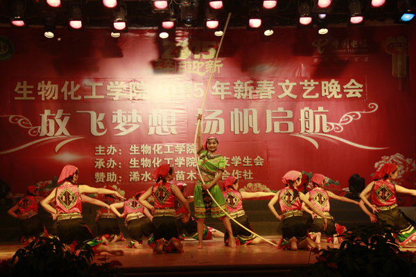 为丰富校园文化生活,展示师生风采,1月12日晚,生物化工学院2015年新年文艺晚会在大学生活动中心举行。校工会主席、党委委员郑柏松,学工处处长熊楚舒,校团委书记杨勇以及浠水金辉苗木专业合作社董事长欧桂林、副董事长刘明、总经理曾庆国到场观看。整场晚会气氛热烈,掌声如潮,让整个礼堂都流光溢彩、激情四射。