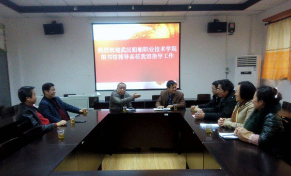 熊承刚对我馆热情接待表示感谢,肯定我馆先进管理经验,同时介绍了武汉船舶职院信息中心基本情况和存在的问题,并就馆藏资源建设和图书馆信息化建设、校园数字化建设方面进行了认真的交流和探讨。