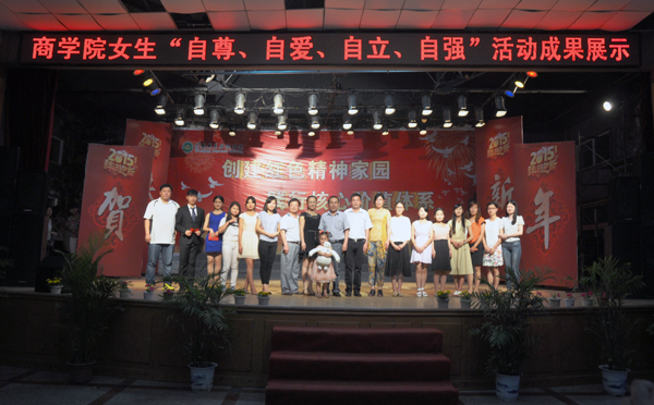 2015年5月19日晚,商学院在大学生活动中心举行了“四自”女生典型成果汇报会。莅临汇报会的领导老师有校学工处处长熊楚舒,商学院党总支书记白颢,校团委书记、学工处副处长杨勇,校团委副书记陈胜红,商学院党总支副书记焦爱新,商学院团总支负责人马亚飞,商学院女生辅导员万建华,团委老师汲艳蕊及商学院的全体辅导员。