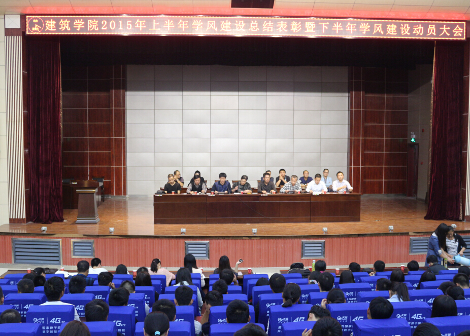 2015年10月14日晚上,建筑学院2014—2015学年第二学期学风建设总结表彰暨2015—2016学年第一学期教风学风整顿动员大会在学校学术报告厅顺利召开。建筑学院党总支书记朱建军,副院长夏端林、张志俊,副书记刘国峰,全体专业负责人,实训中心主任,团总支书记及专兼职辅导员等出席了会议,会议由办公室副主任王红兵主持,2015级全体学生及2014级部分学生代表参加了大会。