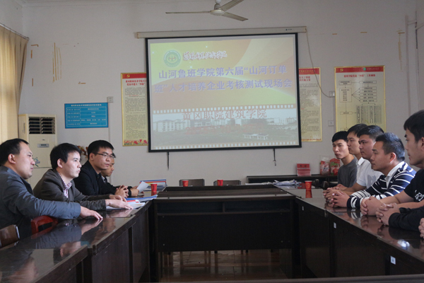 现场会第二阶段。下午,在培智楼二楼会议室,由公司领导对“山河订单班”同学进行企业考核测试。考核的内容分四个方面:学业成绩、沟通协调能力、管理能力和在校获得荣誉。第一批通过考核测试的同学,将于11月初到集团公司集中培训,然后分配到各个项目部进行顶岗实习。