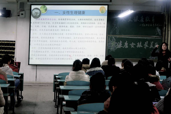 胡丹梅老师的讲座分别从“女性的生理健康、大学生婚恋观、大学生性教育、青春无艾才幸福以及意外怀孕怎么办”五个方面对女生健康一一进行讲授。首先她从生殖卫生、经期保健和预防妇科疾病三个部分对女性生理健康进行了讲解。其次从校园恋爱的不良现象谈到女生如何树立正确的恋爱观,讲述了怎么样培养爱的能力与责任,强调了恋爱观包含着道德责任和法律法规的约束。接着谈到性教育与大学生成长的意义,引导女生把今天学到性教育的知识转化为坚定的信念和自觉的行为,建立促进身心健康的、符合社会道德规范的人生观、价值观和生活方式。然后通过图片展示、具体的数据和学生互动,让同学们深刻的意识到艾滋病并没有我们想象的那么遥远。最后通过婚前性行为、未婚先孕的惨痛案例给当事者,尤其是女大学生及其家庭带来的生理、心理的危害作了详细的讲述,给女生敲响了警钟。同时对女生意外怀孕给出了合理的建议,并现场发出拒绝婚前性行为的倡议。整个现场秩序井然,气氛活跃,同学们对胡老师提出的问题都给予充分的回应。