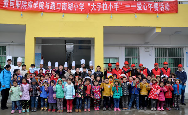 儿童是祖国的未来,儿童的营养膳食需要社会更多的关注。为了呼吁更多社会人士关注儿童膳食健康,引导儿童合理膳食,关爱儿童健康成长,12月24日,校团委、商学院团总支及烹饪工艺与营养专业的师生在黄州区路口镇南湖小学开展了“爱心午餐”活动。出席本次活动的领导和老师有校团委书记杨勇,商学院院长袁畅、烹饪专业教师杨清、辅导员万建华和杨方老师。