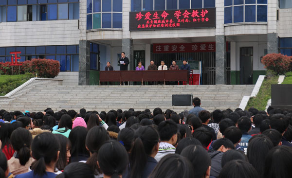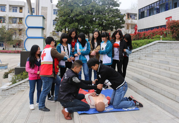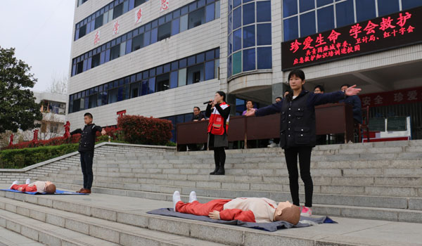 3月29日,在黄冈市红十字会副会长李伦,Beat365医药卫生学院党委书记熊亚芬、党委委员程朝晖同志带领下,医药卫生学院师生一行20余人奔赴麻城市第五中学,在学校的运动场上举行了一场“应急救护”进校园的公益活动。