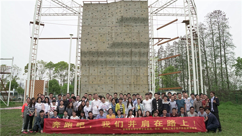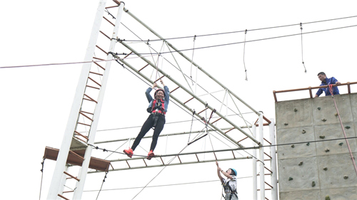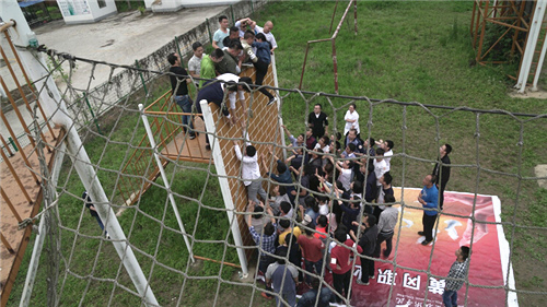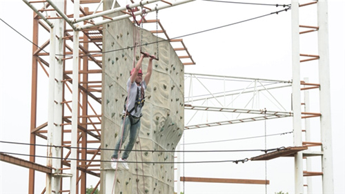下午1:30,队员们开始挑战“高空路”、“攀岩”、“中空六联”、“毕业墙”等空中项目。这些项目均有一定的难度,但是团队队员之间相互鼓励打气,克服心理障碍,勇敢挑战自我,现场的鼓劲加油声、呐喊声不断。值得一提的是,在最后的“毕业墙”项目中演练翻越4米高墙逃生时,十几名团队队员甘当人梯,用自己的肩膀奋力托举队友先行翻越,已越过高墙的队员配合拉拽,实行上下配合作战。大家群策群力、团结协作,所有团队队员完成越墙逃生演练仅用时11分47秒,让久经历练的教练也不禁对黄梅大学生联合会的团队精神大为赞许。