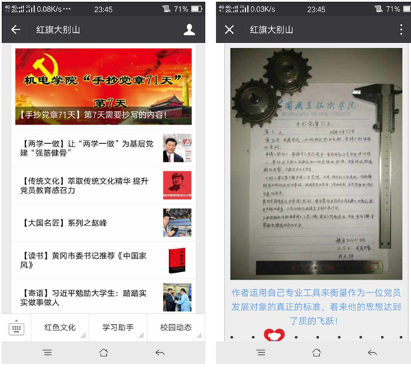 为迎接建党95周年,引导党员尊崇党章党规,坚定理想信念,结合“两学一做”学习教育活动要求,机电学院在学生党员、入党积极分子以及学生干部中开展了“手抄党章71天”活动。“今天你抄了吗?”成为机电学院师生的流行语。