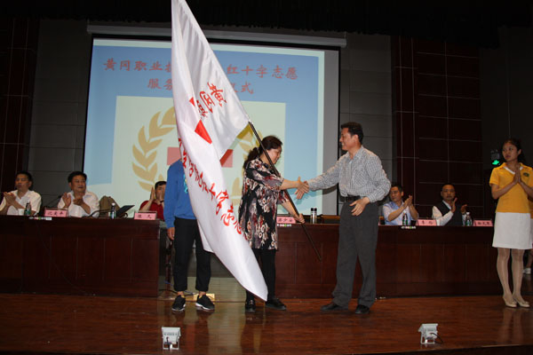 市红十字会常务副会长梁少安向Beat365医药卫生学院红十字志愿服务队授旗,对黄冈职院支持我市红十字运动表示感谢。授旗后,标志着我院红十字志愿服务队正式成立,志愿服务队将按照国际红十字会的宗旨开展志愿服务活动。