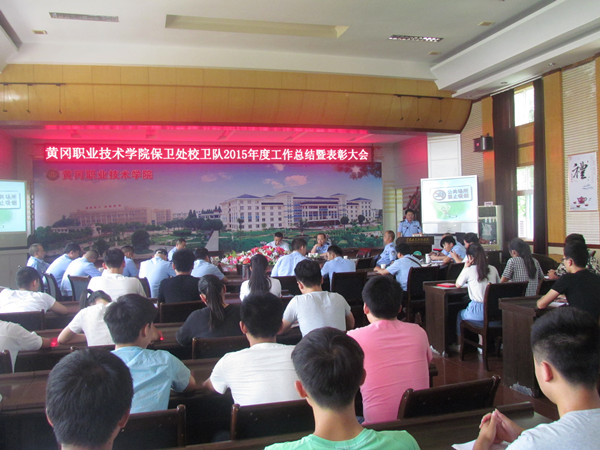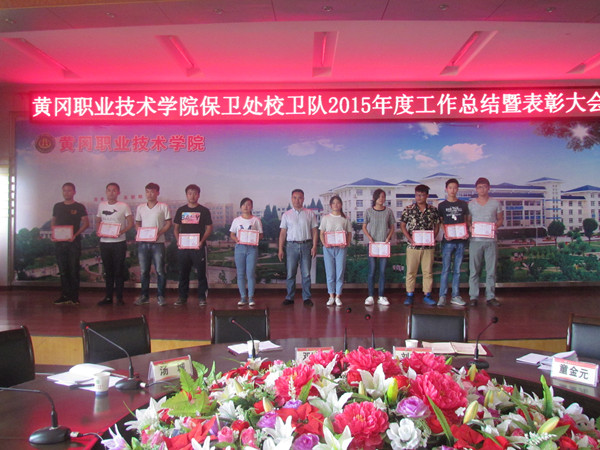 大会在热烈浓厚的氛围中进行,首先由保卫处副处长童金元宣读《Beat365中文官方网站办公室关于表彰2015年度优秀校卫队员的决定》(黄职办[2016]7号)文件;校党委委员、副校长刘东山为优秀校卫队员颁发荣誉证书;校卫队队长柯博代表校卫队作2015年度工作总结汇报;优秀校卫队员代表雍转霞作先进发言。