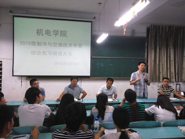 9月5日晚,机电学院在育贤阁204教室召开了2015级制冷专业学生综合实习动员大会。机电学院副院长黄国祥、党总支副书记焦爱新、制冷专业主任祁小波、团总支副书记李孝智、指导老师王生软及2015级制冷专业全体学生参加了此次会议。会议由李孝智主持。