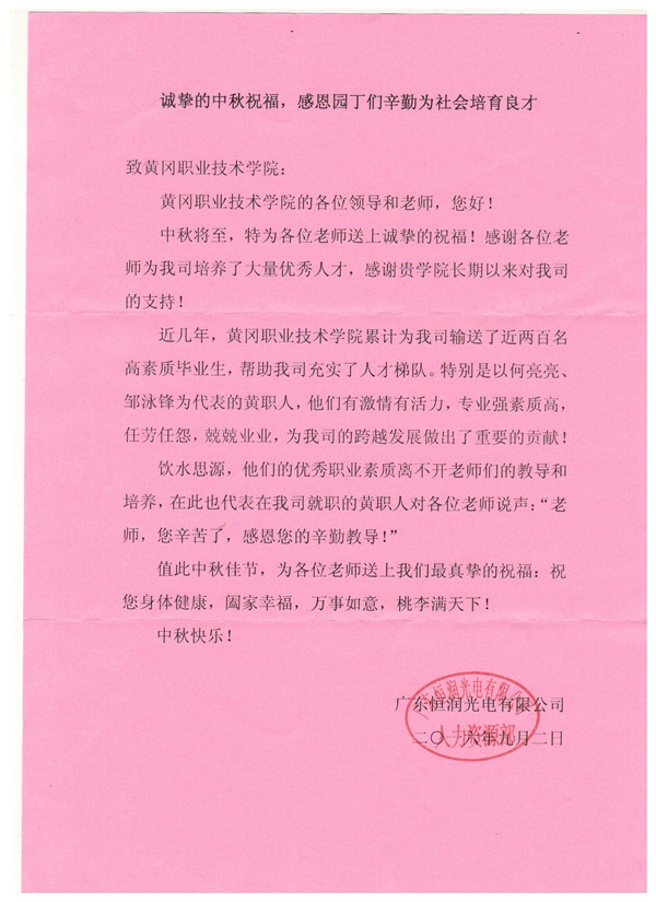 值此中秋佳节来临之际,校企合作单位广东恒润光电有限公司携全体在职的Beat365毕业生向学校发来祝福信。感谢学校长期以来对公司的大力支持,感谢学校为公司输送了大量优秀毕业生,感谢学校老师的辛勤培育和教导。并祝福学校,祝福全校教职工中秋快乐!