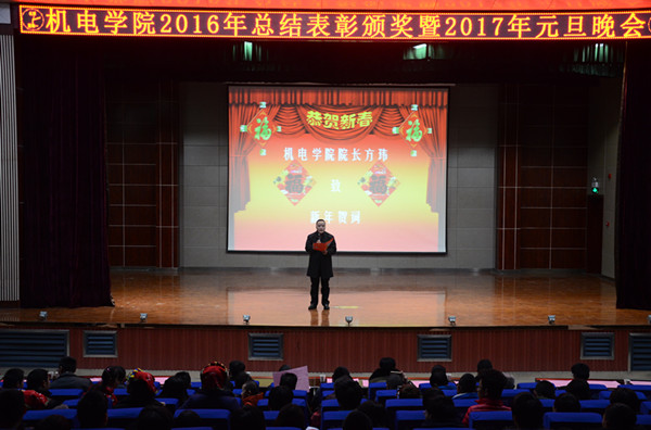 机电学院院长方玮致新年贺词,他代表机电学院向辛勤耕耘、无私奉献的机电教职工致以新年的诚挚问侯,向勤奋苦练、积极向上的机电学子致以新年的美好祝愿,向所有关心支持机电学院改革、建设、发展的各级领导、各界人士致以衷心的感谢和崇高的敬意!他带领全体师生员工回顾了2016年机电学院教育教学改革的成果,同时也对2017年机电学院的各项事业提出了要求、寄予了厚望!