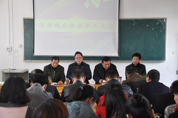 2017年2月14日下午,商学院在群贤阁307召开了2017年工作部署大会,商学院班子成员及全体教师参加了会议。会议由商学院书记白颢主持。