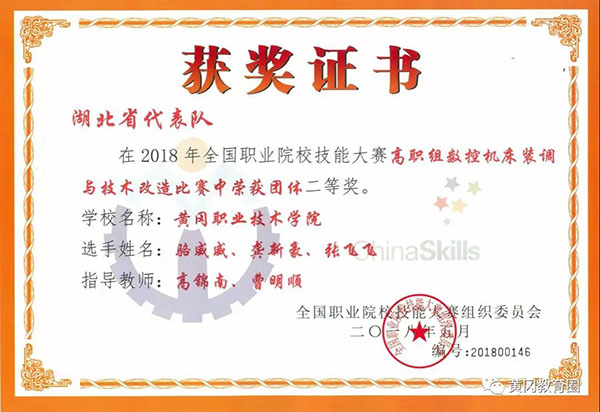 参赛选手在300分钟内,根据赛项任务书的要求,借助赛场提供的设备、检具、工具、技术资料、PLC及系统固有软件和计算机等,完成数控机床电气设计与安装、数控机床机械部件装配与调试、数控机床故障诊断与维修等系列高精项目。黄冈职院机电学院曹明顺、高锦南老师指导的数控201502班龚新豪、机电201506班骆威威、数控201602班张飞飞同学组成的团队,在此次大赛中喜获团体二等奖。