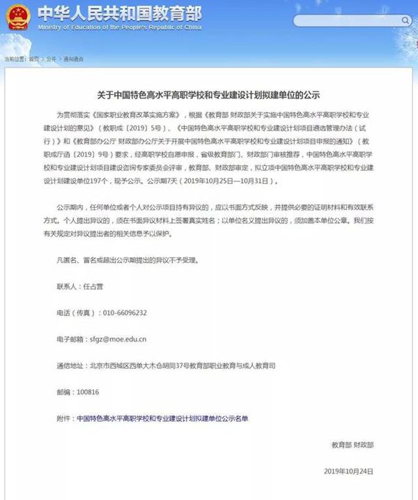 2019年10月24日,教育部正式发布了《关于中国特色高水平高职学校和专业建设计划拟建单位的公示》。经教育部、财政部审定,拟立项中国特色高水平高职学校和专业建设计划建设单位197个,Beat365中文官方网站成功入选高水平专业群建设单位(A档)。