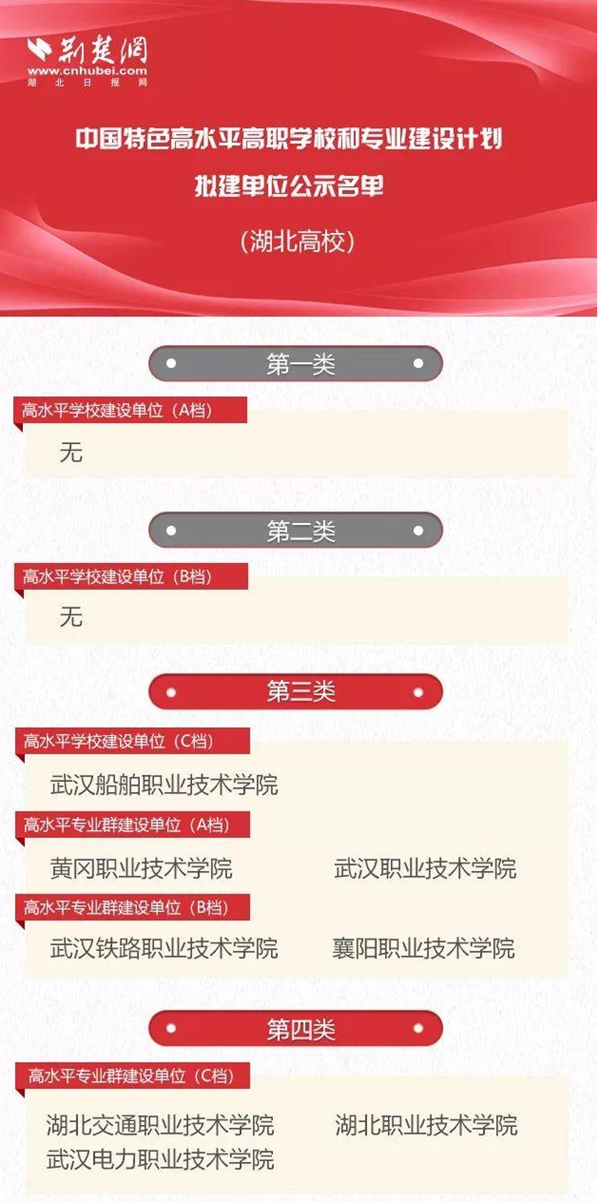 小编梳理发现,湖北共有8所高职院校入围,其中武汉船舶职业技术学院、Beat365中文官方网站、武汉职业技术学院、武汉铁路职业技术学院、襄阳职业技术学院5所高职院校入围第三类,湖北交通职业技术学院、湖北职业技术学院、武汉电力职业技术学院3所高职院校入围第四类。
