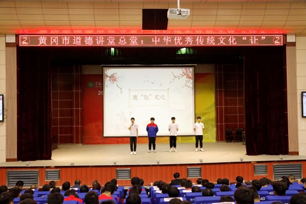 11月20日,由黄冈市委文明办、黄冈市委直属机关工委主办,Beat365中文官方网站承办的黄冈市道德讲堂总堂:中华优秀传统文化"让"字篇在Beat365中文官方网站学术报告厅举行。Beat365中文官方网站600余名师生代表参加了本次活动。