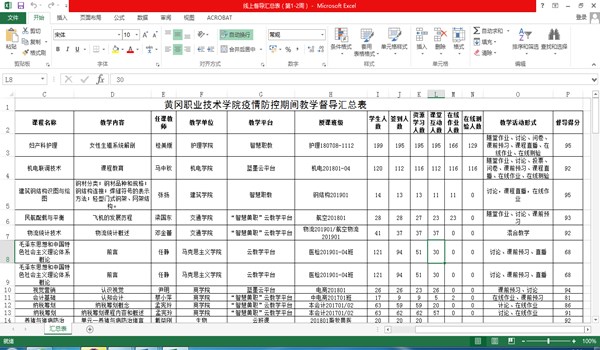 截止到2月29日,在学校自主开发的“智慧黄职”云教学平台上,共实际开设课程393门,注册教师数511人,注册学生数17710人,开设各类教学班级1516个,建设有效资源16171条(其中视频资源6837条,音频资源35条,动画资源366条),各种讨论发言次数147449次,发布作业此时5894次,发布测试2535次,发布小组任务314次,学生总在线时长653205小时,学生平均在线时长36.88小时。