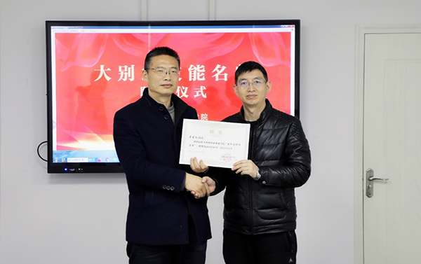 罗幼平向受聘的大别山技能名师武汉唯众智创科技有限公司董事长辜渝傧颁发证书,并回顾了自2011以来,与该公司在国家师资培训、技能大赛、教学资源建设、教材建设等方面取得成果,希望学校与企业以此为契机,开展更加深度合作,更好地支持学校建设和发展。